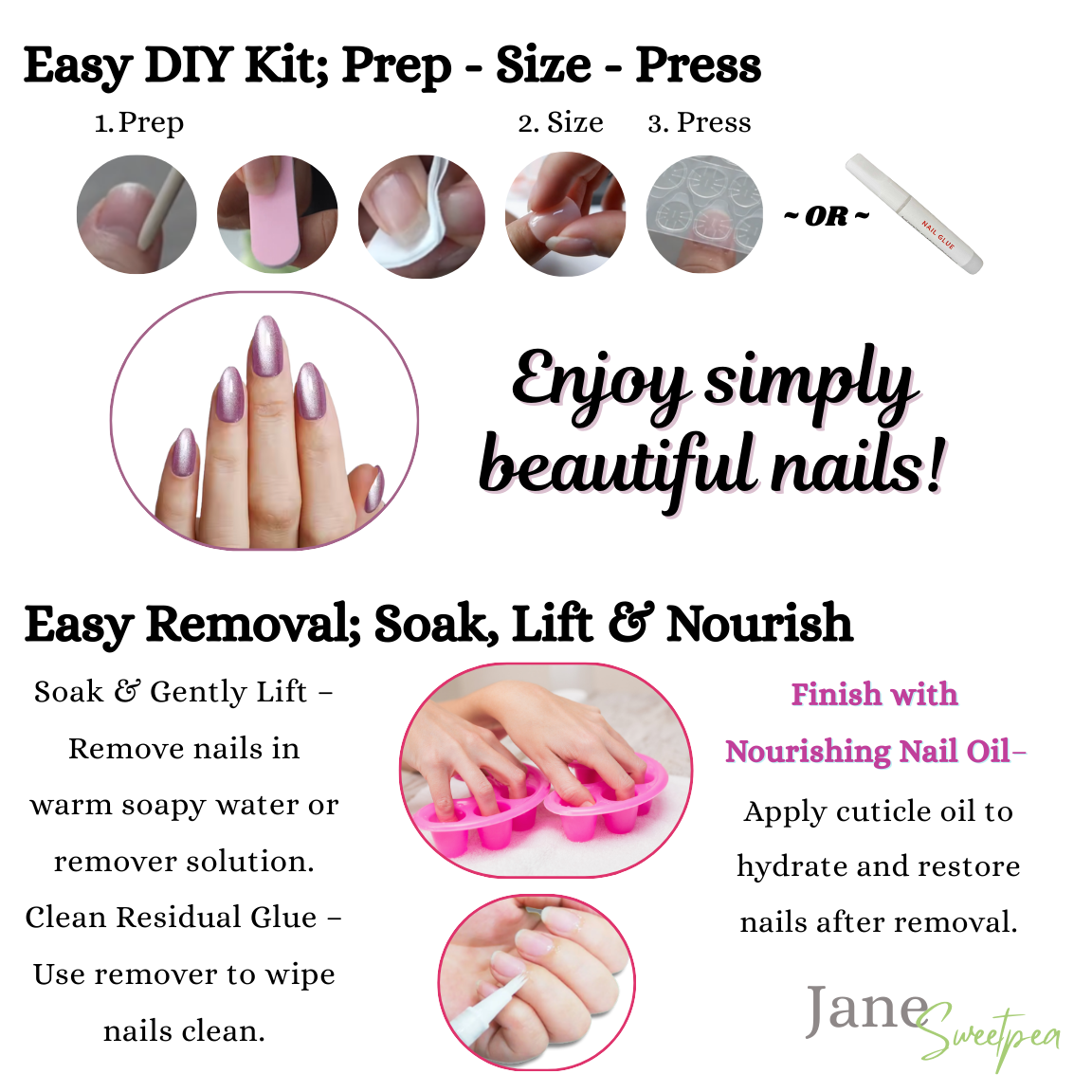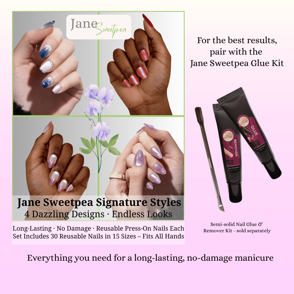 Each Jane Sweetpea set is designed to bring salon-quality elegance into your hands, with easy application, lasting wear, and dreamy designs you’ll love to show off.